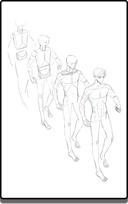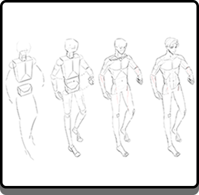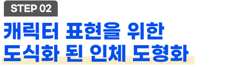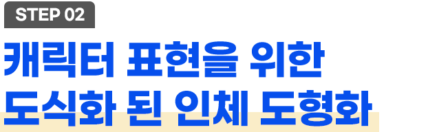 얼굴 뼈의 구성원리를 이해하고 단계별로 얼굴 도형화 학습을 한 후 몸통뼈의 구성원리를 통해 인체 비례지표를 통한 비율을 학습하고 동세 표현을 실습합니다. 팔과 다리, 손과 발 구성원리를 이해하면 개방, 폐쇄 원리로 캐릭터의 성격을 묘사해 나갑니다.