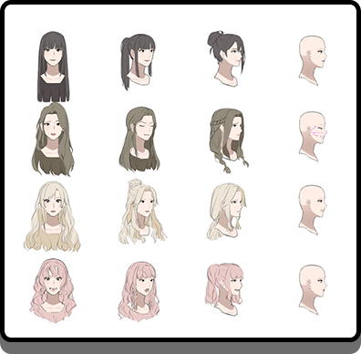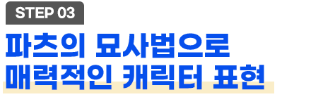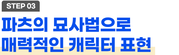 이목구비의 표현실습을 통해 감정을 표현하고 헤어라인, 스타일 연출 방식을 이해하며 실습해 나갑니다. 도형화를 기반 으로 복식의 재질감, 두께감에 따른 소재별 주름을 묘사하며 캐릭터를 심화시키고 매력도를 높이는 방법을 학습합니다.